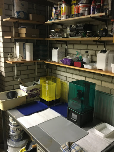 Given the amount of other equipment I'd acquired, it made sense to set the printer up in the garage. This meant I had to clean up the area on the workbench and the shelving above it. What I thought would be a few hours turned into a couple of days. I had to make some extra shelving just to hold all the paraphernalia for printing. But, eventually, it was ready ... except the nitrile gloves hadn't arrived in time.